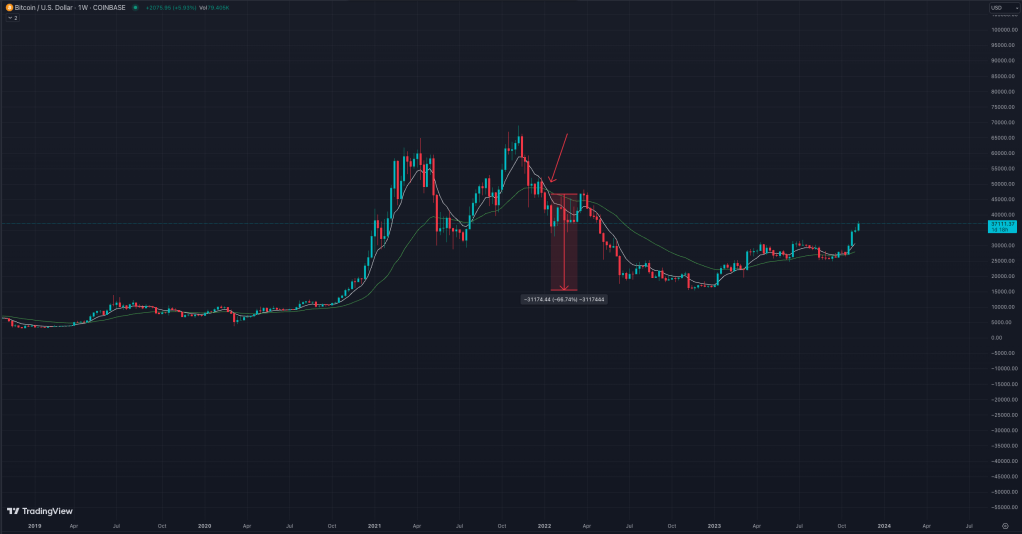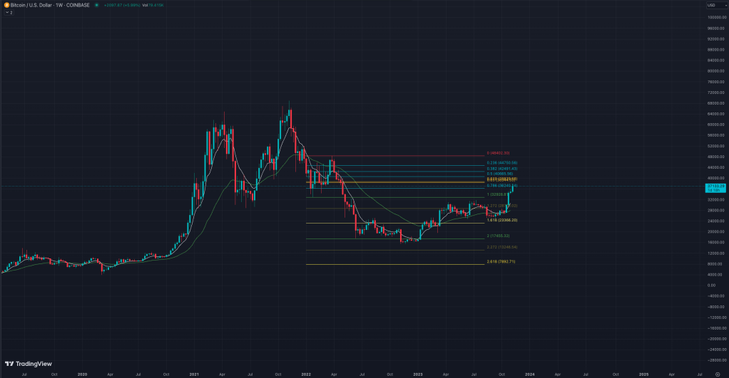 Now, let’s focus on the eagle itself. As the market landscape is painted with emotions, the 8-day Exponential Moving Average (EMA) represents the turbulent winds of fear and greed. When our wise eagle takes a calculated dive, crossing the 34-day EMA, it symbolizes a momentous turn—a clash of emotions in the financial skies.