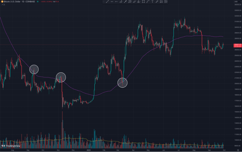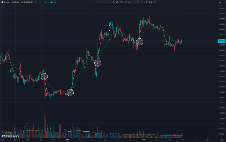 Besides being dynamic support or resistance, moving averages can also act as trend-following indicators. For example, when a short-term moving average crosses above a long-term moving average, it’s seen as a bullish signal, acting as a form of resistance for downtrends.
